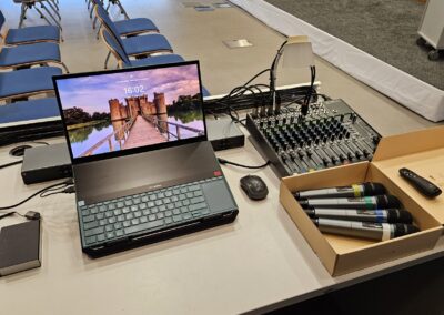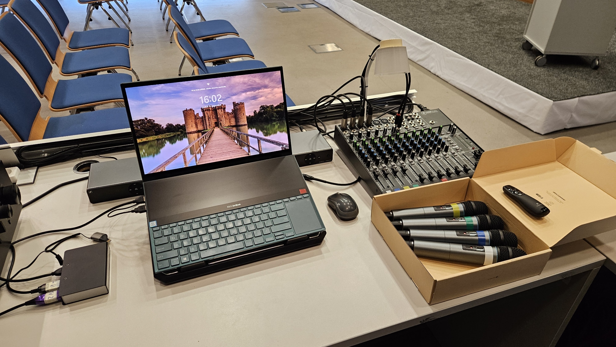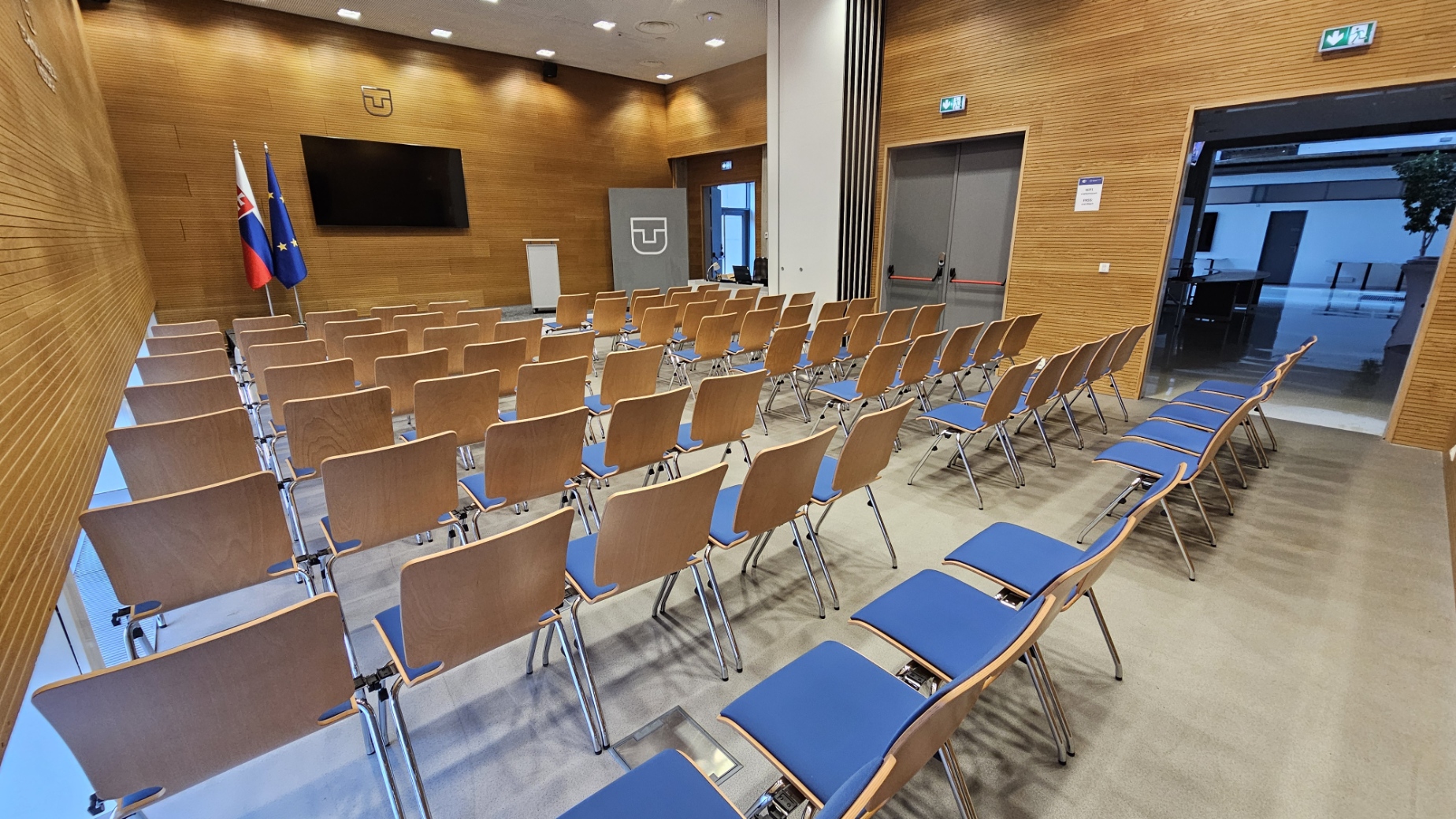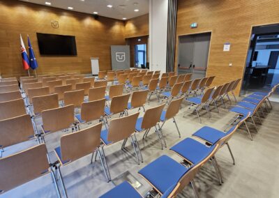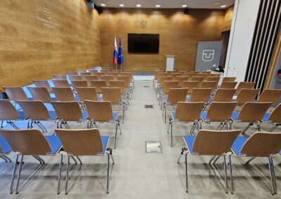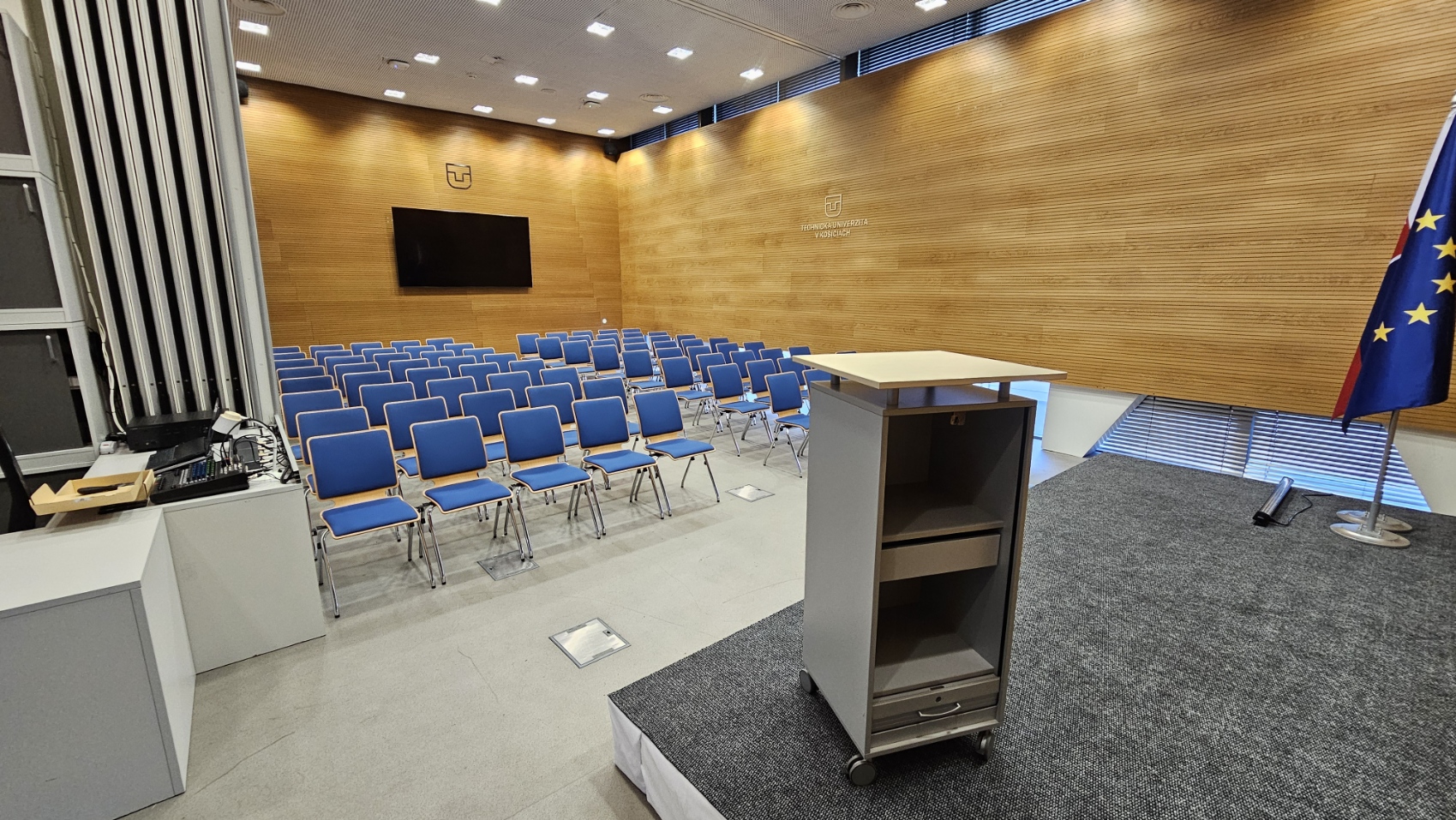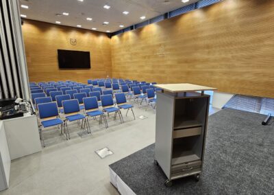 Vybavenie: prezentačná TV, monitor/čítačka TV, rečnícky pult, kliker, 4 hand mikrofóny, inteligentná kamera, farebné nasvietenie