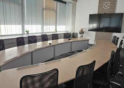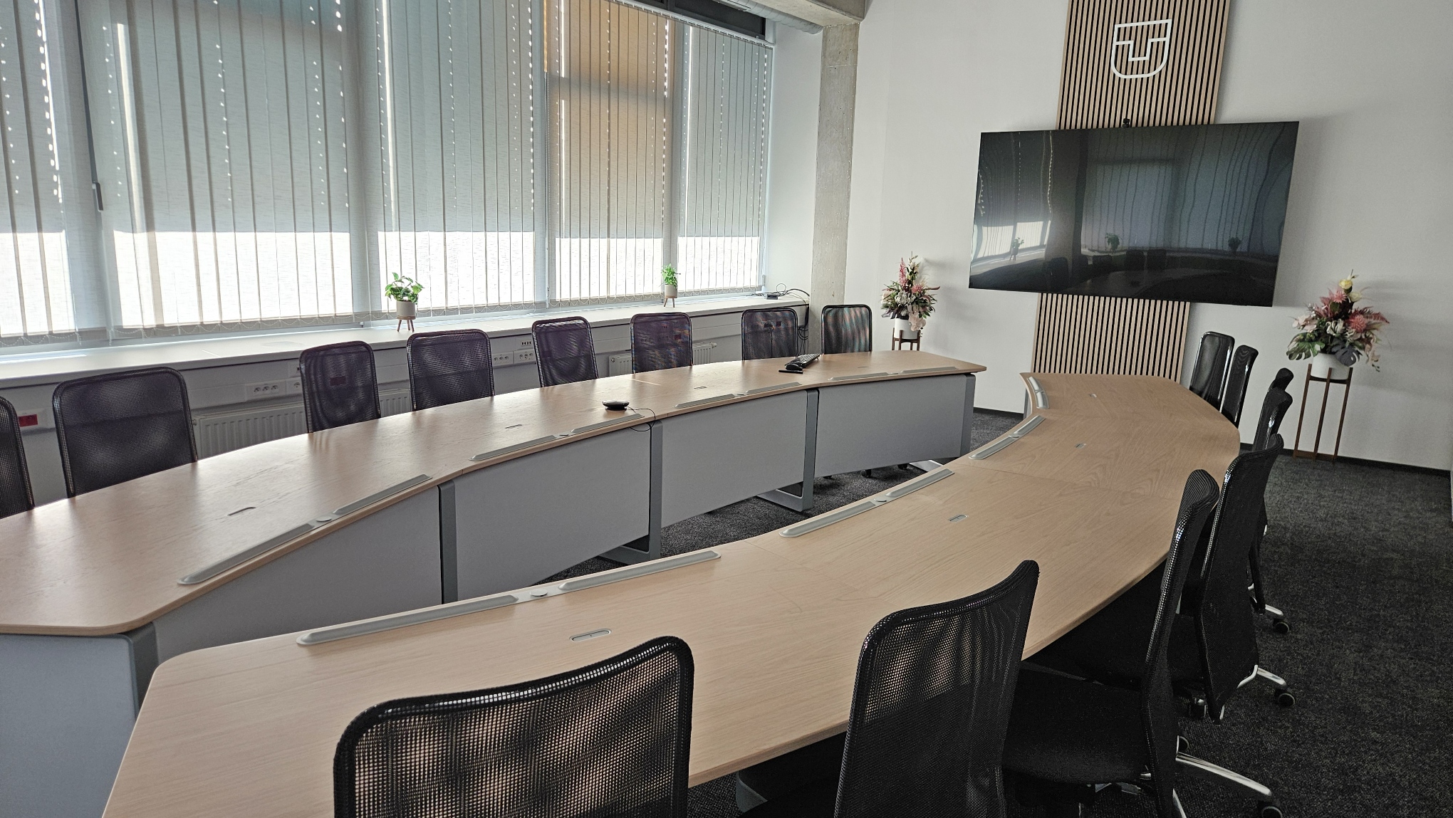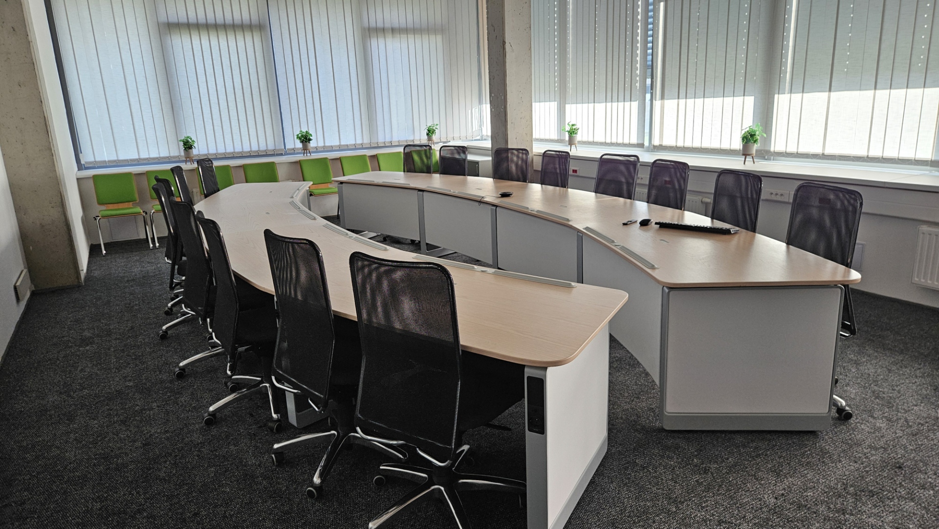 Vybavenie: prezentačná TV, obslužné pc s bezdrôtovým ovládaním (myš + klávesnica), kliker, inteligentná kamera, stoly s elektrozásuvkami